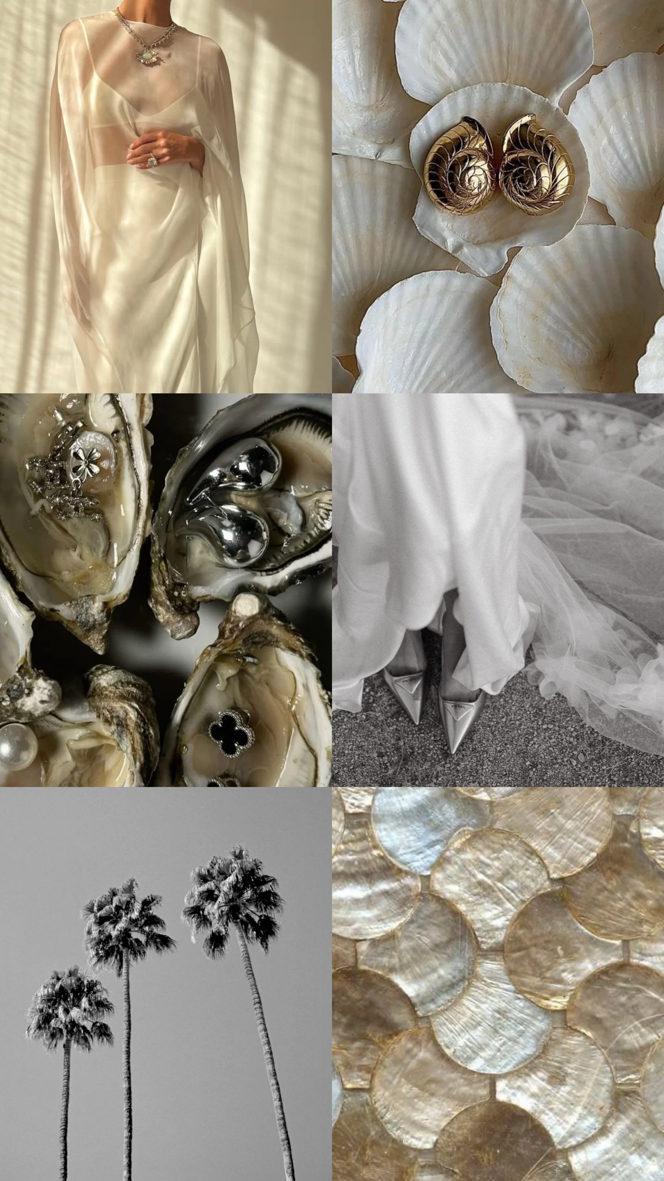 A soft, luminous bridal concept inspired by the elegance of coastal textures and warm desert light. Flowing fabrics, delicate jewelry, and iridescent shell details all working together for an atmosphere that feels refined and feminine. With an emphasis on light, movement, and intimate details, this scene focuses on the subtle beauty of bridal styling — layered textiles & organic elements — resulting in imagery ethereal, editorial, and effortlessly photos.